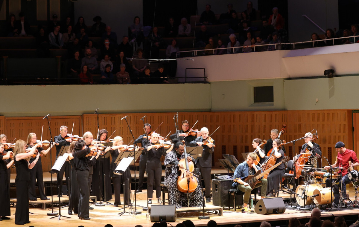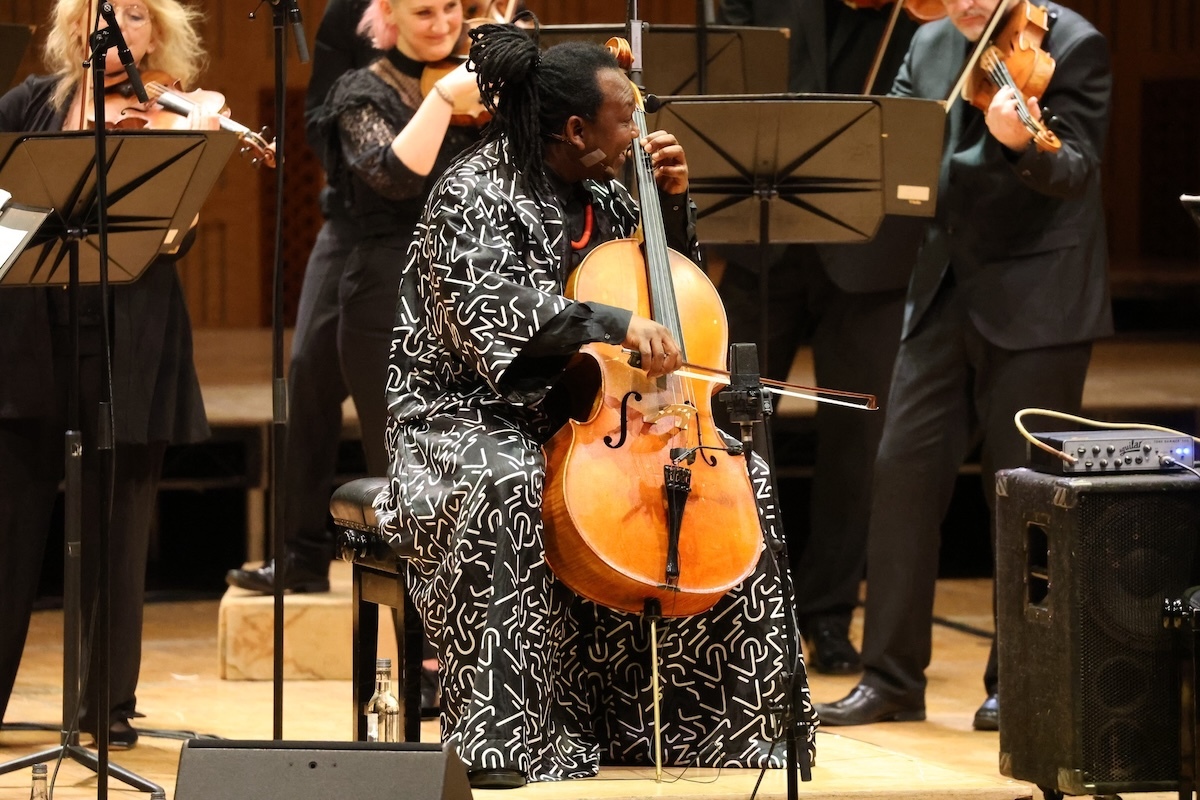 Joining the orchestra on stage after the Janáček, Selaocoe took the role of an MC. He described the concert as ‘a feast of languages’, before the group began his song ‘Qhawe’, a Xhosa word meaning ‘hero’. He described it as signifying a ‘hero of heroes’, who stands up for those who can’t stand up for themselves. Schimpelsberger’s percussion was a solid foundation on which was built a true abundance of techniques, with Selaocoe playing rapid free passages on the cello, singing (sometimes dropping to bottom-register throat song), speaking, and leading both orchestra and audience. In parts, the orchestra sang; in others the audience responded to calls from the stage. There was a rapid duet for Selaocoe and Sweeney, and improvised solos. Keary took a particularly impressive extended solo that showcased a crystalline sound.